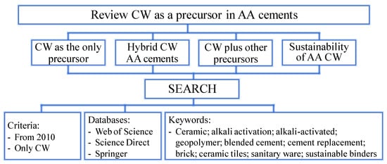 The conducted bibliographic search is summarized in Figure 1. It focused on research works from 2010 to 2022, and only covered CW studies (any research into the AA of concrete waste or CDW was excluded). Following these criteria, 82 bibliographic references were found. After reading and summarizing them all, only the most significant and representative research works on the AA of CW were included. This review is divided into three main sections: (i) AA materials developed with only one ceramic precursor; (ii) hybrid materials with a ceramic precursor, plus a traditional binder; (iii) combinations of several materials as precursors in AA systems. Finally, a sustainability and carbon footprint analysis of CW AA binders was conducted. Therefore, this systematic study presents the main findings reported in the literature concerning the production and characterization of CW in alkali-activated systems. The research analyzes the variation of properties depending on the type and concentration of the alkaline activating solution, curing time and temperature. Additionally, the study identifies existing gaps and highlights potential future research topics in this field.