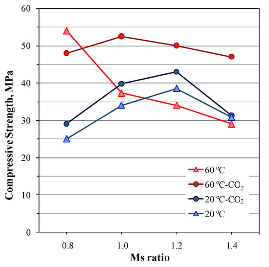 Scheinherrová et al. [60] studied the carbonation process in mixtures developed by AA with NaOH/SS solutions of powder waste obtained from cutting bricks (BCW). The quantities of BCW, SS and water remained constant and the NaOH concentration varied. This gave SiO2/Na2O ratios (Ms) of 0.8, 1.0, 1.2 and 1.4 (referenced as A, B, C, D, respectively). The authors compared the behavior of air-exposed mixtures cured at 20 °C to others exposed to accelerated carbonation (20% CO2 and 85% RH for 10 months) after being cured at 60 °C for 6 days (85% RH) and also at 20 °C for 21 days. Some efflorescence arose in mixture A (SiO2/Na2O ratio of 0.8) when cured at different temperatures and exposed to air, which was attributed to excess alkalis. As reported in Figure 2, in the samples cured at 20 °C, the compressive strength values generally improved with the Ms ratio and reached a maximum of 38.5 MPa for the 1.2 samples. This behavior was attributed to a uniform microstructure due to the partial dissolution of the precursor. Conversely, curing at 60 °C positively influenced the strength of the samples developed with lower SiO2/Na2O ratios (A and B) but negatively affected that of the pastes prepared with higher ratios (C and D). Consequently, the authors concluded that the Ms modulus had a stronger influence on the mechanical properties than the curing temperature. When exposed to accelerated carbonation, the main identified phases were calcite and vaterite, whose formation enhanced mortars’ compressive strength. This improvement was more significant in the samples cured at 60 °C than in those cured at 20 °C, which was attributed to a reduction of porosity due to CaCO3 crystallization. Unlike PC carbonation, however, where formed carbonates are generally insoluble, the authors stated that this improved strength in geopolymers may be temporary because the formed carbonates are soluble.
