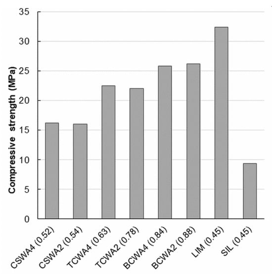 Reig et al. [63] combined the use of TCW powder as both a precursor (TCWP) and an aggregate (TCWA) in geopolymeric systems. The influence of different aggregate types was investigated: siliceous, calcareous, obtained from CSW waste (CSWA) and from red clay bricks (BCWA). As the siliceous and calcareous sands had particle sizes below 2 mm and 4 mm, respectively, the CW aggregates were prepared with two different particle size distributions: below 2 and 4 mm. All the aggregates were physically characterized. The relative density of the dry particles varied between 2.23 g/m3 (BCWA2) and 2.73 g/m3 (natural limestone). The water absorption values also varied within a wide range from 1.58 wt.% for CSWA2 to 11.64 wt.% for BCWA2. TCW was first used only as a precursor (TCWP), and mortars were prepared with natural siliceous and calcareous aggregates. TCW was AA with a NaOH/SS solution prepared with 10 mol/kg of sodium, a SiO2/Na2O ratio of 1.16 and a water/binder (w/b) ratio of 0.45. To improve the geopolymerization process, 5% Ca(OH)2 was applied as a source of calcium in all the prepared samples. After 3 curing days at 65 °C, the mortars prepared with the siliceous and limestone aggregates gave compressive strength values of 9.45 MPa and 34.22 MPa, respectively (TCWA could not be employed under these conditions because workability was insufficient). Given the large differences between the water absorption values of aggregates, they were presaturated before the mixing process to maintain a constant effective w/b ratio of 0.45 for the precursor. Figure 3 (adapted from reference [63]) summarizes the compressive strength of the mortars prepared with all these aggregates cured at 65 °C for 3 days. As it shows, the total w/b ratio (in brackets) varied depending on the water absorption of aggregates; thus, BCWA2 and BCWA4 exhibited the highest water demand. The best compressive strength results were obtained for natural limestone aggregates (LIM), and CW particles had better strength results than siliceous sand (SIL). The main conclusion drawn by this research was that CW aggregates can be used to replace natural aggregates if they are properly presaturated.