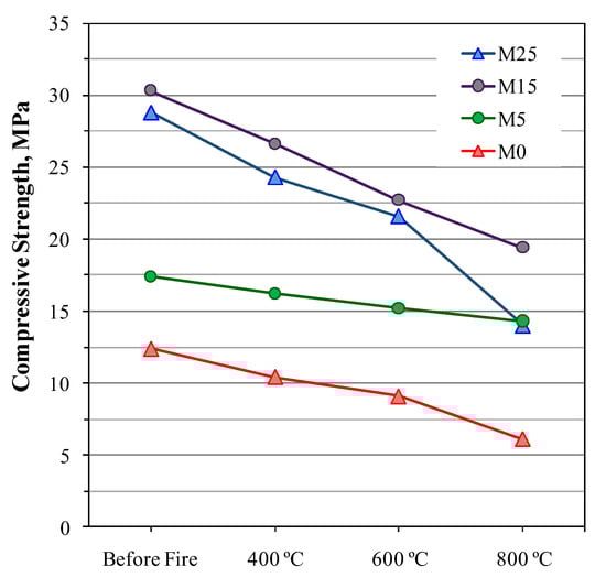 Atabey [80] performed an experimental study on hybrid systems in which 0–25 wt.% CSW wastes were replaced with CAC. Mortars, which were cured in an oven at 90 °C for 24 h and held at 23 °C and 55 °C for up to 28 curing days, were prepared using a binder/sand ratio of 1:3, a w/b ratio of 0.50 and a set amount of Na2O (10 wt.% of the binder). It was observed that larger amounts of CAC increased the flow table values due to the lower water absorption of CAC compared to that of CSW. Improvements in mechanical strength were also achieved with up to 15 wt.% CAC (about 30 MPa after 28 curing days). The authors explained this by the densification of the microstructure with CAC addition, which led to the formation of both C-A-S-H and N-A-S-H gels. Compressive strength decreased for the samples exposed to high temperatures due to pore formation (Figure 4).