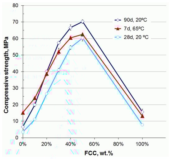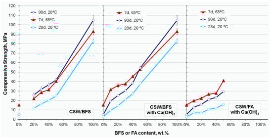 Cosa et al. [39] assessed the mechanical and microstructural properties of AA binary systems developed by combining CSW and fluid catalytic cracking residue (FCC). The AA mortars and pastes were prepared by replacing 0 to 50 wt.% CSW with FCC and using an AA solution with a SiO2/Na2O molar ratio that varied from 0.78 to 1.94, constant 4 wt.% Ca(OH)2 addition and a w/b ratio of 0.45. Mechanical tests were performed on the mortars cured at room temperature for 28 and 90 curing days and at 65 °C for 7 days. The compressive strength values improved with FCC addition regardless of the curing time. The obtained values went up to 70 MPa in the AA systems containing 50% FCC and cured for 90 days at room temperature (see Figure 5). According to the microstructural analysis, N-A-S-H/(N,C)-A-S-H gels were the main products to form and, depending on the SiO2/Na2O molar ratio, some minor crystalline phases were detected, such as anorthite, herschelite and zeolite type-A.