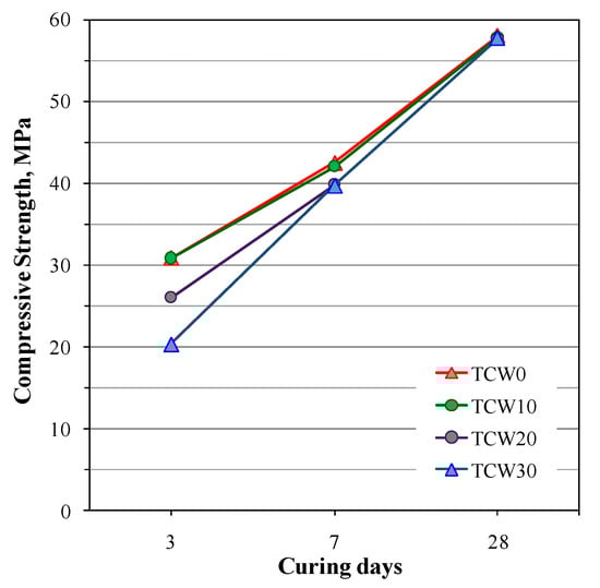 Zhang et al. [86] performed a systematic study about employing TCW (up to 30 wt.%) in BFS AA systems. Mortars and pastes were prepared by mixing a 2M NaOH solution with commercial SS at a constant w/b ratio of 0.46 and a Si2O/Na2O molar ratio of 1.2. The thermal calorimetry analyses showed that cumulative heat reduced over 72 h with increasing TCW contents, which was attributed to its slower reaction at early curing ages compared to BFS. Regarding the compressive strength results (Figure 7), although larger amounts of TCW caused a slight reduction at 3 and 7 curing days, no differences for the reference sample were observed after 28 curing days and all the strength values came close to 57 MPa.