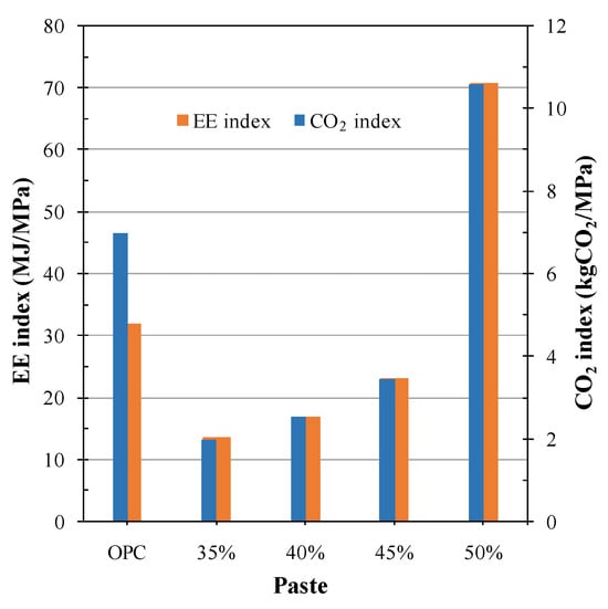 Fořt et al. [59] prepared different pastes by activating brick powder waste (BCW) with SS and sodium hydroxide solutions (silicate modulus: 1.4). These authors considered the high energy use and CO2 emissions associated with both chemical reagents: 5462 MJ/ton and 15.24 kgCO2/ton for pure SS and 6965 MJ/ton and 1930 kgCO2/ton for pure sodium hydroxide. These values are significantly higher than those reported for PC, namely 2986 MJ/ton and 829 kgCO2/ton. The energy use of the BCW precursor was 135 MJ/ton and CO2 emissions were 28 kgCO2/ton. These values were related to the grinding process. The pastes prepared by activating BCW had a relative SS content of 35%, 40%, 45% and 50% in relation to the amount of the precursor (the precursor did not harden with 30% SS). Despite the high SS proportion, both energy use and CO2 emissions were much lower than those reported for PC: energy use and CO2 emissions lowered within the 63–50% and the 81–75% ranges, respectively. The best values were obtained for the mixture prepared with the smallest amounts of SS (40% of BCW). The combined functional (compressive strength) and environmental properties assessment is depicted in Figure 8. It is noteworthy that using high SS proportions is not a good solution from an environmental point of view because of the low compressive strength yielded after 28 curing days.
