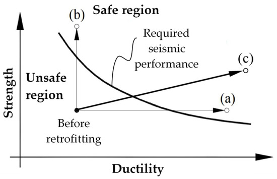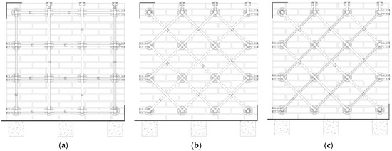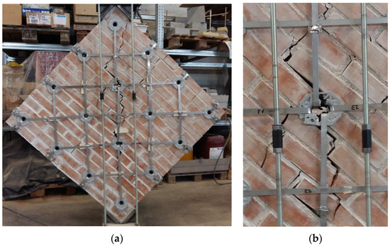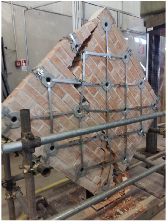 - As assumed in Section 1.2, the rectangular arrangement with straps parallel to the mortar joints (in both directions) is labile. In fact, after a short horizontal plateau at the maximum shear stress (Figure 30), specimen M1-90 undergoes a brittle failure. This means that the straps crossing the failure planes are unable to counteract the relative displacements activated by the failure process along the slip planes. Due to the forces acting orthogonally to their direction, these straps rotate around the hinged nodes of the CAM-like system, which activates the free nodal displacements of the unbraced scheme shown in Figure 3a. Consequently, the rectangular strengthening system with straps arranged along the mortar joints is ineffective in terms of increasing the maximum load. However, it is not entirely useless: keeping the various parts that make up the masonry wall together even after the activation of the slip planes prevents the debris from falling. In fact, the steel straps do not break at the maximum load. This allows them to act as a debris containment garrison, similar to rock-fall nets on rocky slopes. Furthermore, the box-type behavior created by the continuous strengthening system in a building (Figure S3) protects individual structural elements from out-of-plane overturning and prevents the entire structure from collapsing. Therefore, each structural element undergoes limited horizontal displacements after failure, which allows us to define a pseudo-ductility even for the building that has exceeded the shear strength. This makes the strap arrangement of specimen M1-90 a very useful tool for the (preventive) safety of the structures and, ultimately, for safeguarding the safety of the inhabitants. As a final remark, since specimen M1-90 deviates only slightly from linearity up to the maximum shear stress, it seems reasonable that the straps have no effect on the pre-peak behavior of specimen M1-90. Thus, the maximum shear stress of specimen M1-90 is, to a good approximation, the URM maximum shear stress.