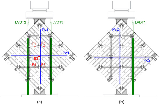 - The strains, and , obtained as the ratios of the relative displacements between the ends of the horizontal and vertical potentiometers (Section 2.3) to the initial lengths of the potentiometers: