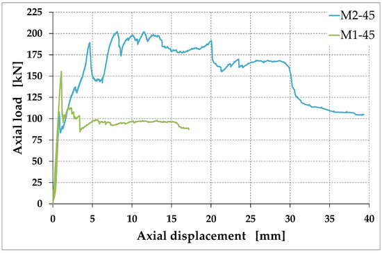 - The maximum load () increased by 30% compared to the maximum load of specimen M1-45 ();