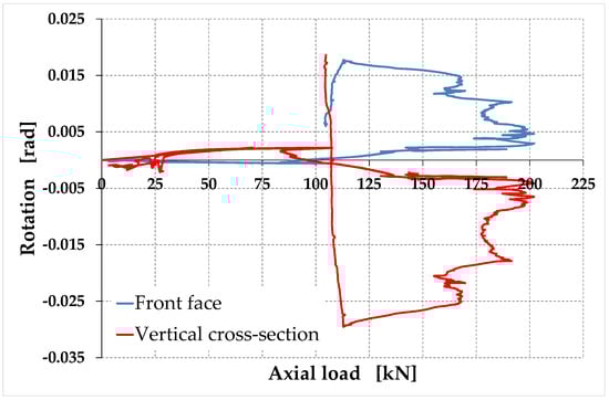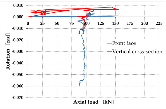 - A rotation of the straps allows the rectangular arrangement to find equilibrium while remaining a labile configuration. The curves of specimens M1-45 and M2-45 in Figure 29 testify to the effectiveness of the arrangement, since they continue well beyond the first peak, caused by the initiation of the crisis in the masonry. This greatly increases the pseudo-ductility of the strengthened masonry wall (Section 4.4). The activation of the strengthening system allowed by the rotation of the straps therefore transforms the failure of the specimen from brittle to markedly ductile. The continuation of the curves beyond the peak of the first crack (first peak) is possible as the arrangement of the straps is labile but balanced, and therefore effective, given the particular load condition. Figure 31 provides an explanation in the Mohr plane of the effectiveness of the arrangement for an actual case of masonry subjected to horizontal (seismic) loading, using the pole method (Appendix A).