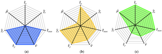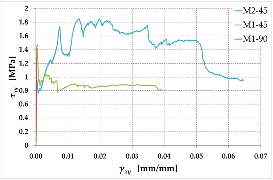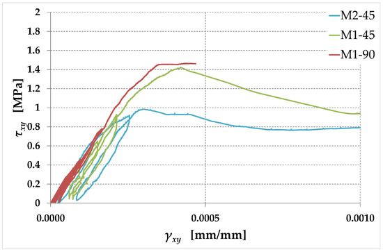 - The smaller area covered by specimens M1-45 (Figure 41b) and M2-45 (Figure 41c) compared to specimen M1-90 (Figure 41a) along the and axes does not in itself have a negative meaning. It simply indicates that damage occurs earlier in RMs than in URMs, but this has no negative effect on the overall behavior at the ultimate state (governed by the variables , , and ) and the shear strength (governed by the variable ).
