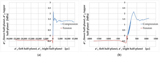 - The Poisson ratios of the specimens with effective strengthening (specimens M1-45 and M2-45) are lower than the Poisson ratio of the specimen with ineffective strengthening (specimen M1-90) and the difference is greater the greater the number of straps. The reason for this is twofold: the possible crushing of the walls of the micro-cavities during the pre-tensioning operations and the confining action of the straps arranged along the direction of the maximum principal stress (horizontal straps), which decreases the value of . The decrease in Poisson’s ratio in RMs compared to URMs makes the use of Equation (13)—together with the hypothesis —even more unacceptable in RMs than in URMs. In fact, the overestimations of Young’s modulus for specimen M1-45 and specimen M2-45 would be about 14% and 16%, respectively.