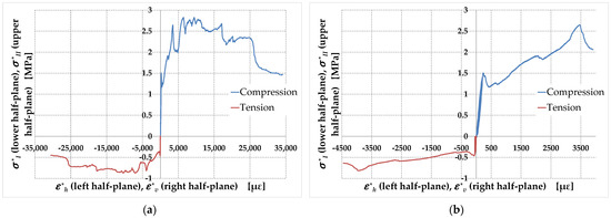 - The details in Figure 35b and Figure 36b show that and take on different values in both specimen M1-45 and specimen M2-45 (Table 6), which is not evident from Figure 35a and Figure 36a. However, although it is reasonable to think that the straps modify the stiffness along the first principal stress direction, the inconsistencies that emerged regarding the discussion on the values of and for specimen M1-90 do not allow us to reach definitive conclusions on the elastic moduli for the RMs.