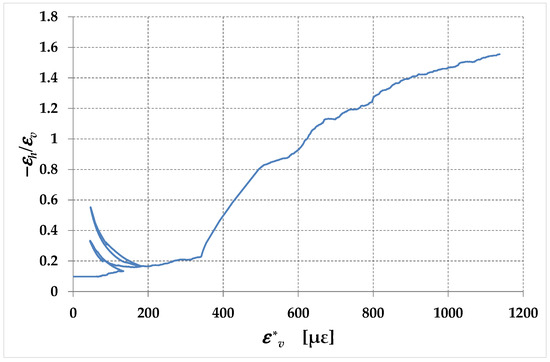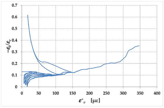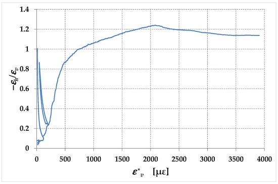 - The apparent Poisson’s ratio decreases for low values of the applied load and increases for high values of the applied load. The reason for the initial decreasing behavior could be the presence of micro-cavities that collapse during the early stages of the load test.