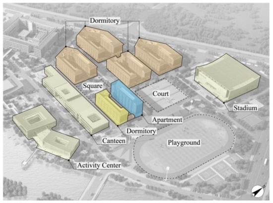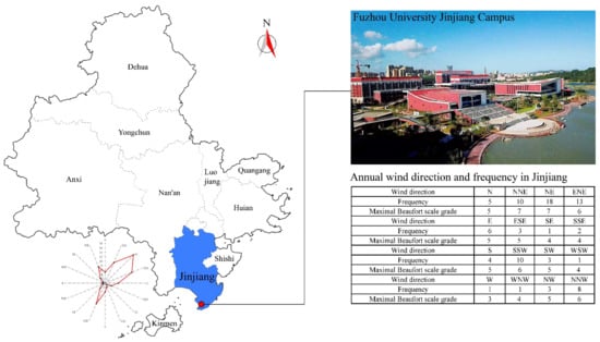 Jinjiang, located on the southeast coast of Fujian Province, has a subtropical monsoon climate with an average annual temperature of 21 °C. In winter, the predominant wind direction is to the northeast with an average wind speed of 2.62 m per second, whereas in summer, the predominant wind direction is to the southwest with an average wind speed of 2.27 m per second. The frequency of northeasterly winds (including NNE, NE, and ENE winds) throughout the year is about 41%. The maximum wind velocity value in these directions can reach Grade 7 on the Beaufort scale (13.9–17.1 m/s). Jinjiang Campus of Fuzhou University is located in Jinjing Town which is on the south part of Jinjiang City with developed transportation. The campus is located on the coastal plain (Figure 1). Approximately 1500 students are currently enrolled at the 1000-acre campus, which consists of faculties and institutions such as the Advanced Manufacturing College, Ocean College, College Students’ Entrepreneurship Education Park, and the Jinjiang Branch of National University Science and Technology Park. The campus structures are primarily comprised of red bricks and white stones, and their design is replete with characteristics of traditional Minnan residences. The teacher–student dormitories are located in the east living area of Jinjiang Campus, adjacent to the basketball court on the north, the stadium on the east, the dining hall on the south, and the undergraduate dormitory groups on the west (Figure 2).