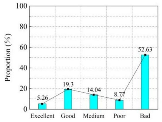 There are ten sets of vacant rooms out of a total of 70 teachers’ apartments. A total of 60 questionnaires were distributed and 57 valid questionnaires were collected. The results of the survey indicate the following: The age of the respondents is mainly distributed between 30–40, accounting for 50.88%. The proportion of respondents living on the 7th to 9th floors reached 70.18%, 29.82% on the 4th to 6th floors, and 0% on the 2nd to 3rd floors. More than half of the respondents rated the outdoor wind environment of the teacher–student dormitory in winter as bad (Figure 4), while satisfaction with the wind environment of the courtyard space was the lowest (Figure 5). The on-site research also revealed that the courtyard had limited usage for rest and recreation during the winter, resulting in a low utilization rate. Respondents on all floors reported that the wind speed of the open corridor on the north side was higher in winter (Figure 6), while the balcony on the south side had the noise of “whistling” generated by the strong winds passing through the doorway, which is more intense during the night compared to daytime. Overall, 61.4% of the respondents believe that the winter wind environment problems on the 7th to 9th floors of apartments are more serious than those on the 4th to 6th floors. The results of the questionnaire provide a subjective assessment of the wind environment by the occupants and serve as a foundation for site selection in the forthcoming wind environment field measurement.