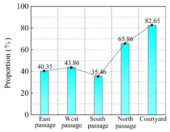 Comparing the wind speed variations at each test point in the courtyard of the dormitory, it can be seen (Figure 15e) that there is minimal change in the wind speed from the east to the west. The trend is gradual, with slightly lower wind speeds at the east and west ends compared to the middle position. This can be attributed to the implementation of the enclosed layout mode in all schemes. The average wind velocity comparison is as follows: scheme 1 (2.94 m/s) > scheme 3 (2.93 m/s) > scheme 2 (2.79 m/s) > scheme 4 (2.78 m/s) > scheme 6 (2.65 m/s) > scheme 5 (2.41 m/s). Since the width of the north passage is similar to that of the courtyard, comparing the average wind velocity in the courtyard and the north passage can be found that the average wind velocity in the courtyard dropped by 23.8%. The enclosed courtyard layout can effectively cope with the weather background of strong winds through mitigating the high-speed airflow. The wind field within the courtyard is stable and appropriate compared to passages.