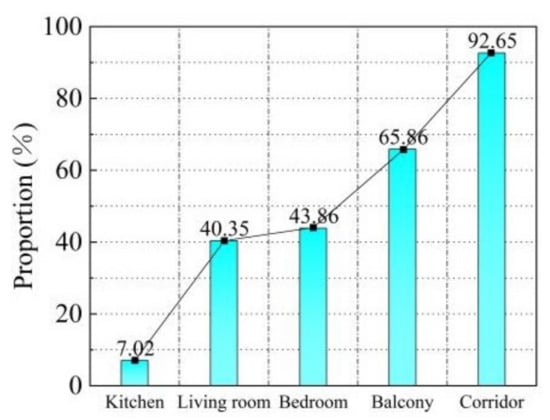 Through the distribution of a questionnaire, a survey of the current status of the winter wind environment in the teacher–student dormitory was conducted. Due to the high vacancy rate of the graduate student dorms, the majority of survey respondents were residents of the teachers’ apartments, resulting in a male-to-female ratio of approximately 2:1. The questionnaire content included the following: (1) the age of the survey respondents, the floor they were on, and the location of the room; (2) evaluation of indoor and outdoor wind environment comfort in winter and ranking of dissatisfied spaces. To ensure that the survey space covers the users’ main daily activity area, the outdoor space includes the passageway around the teacher–student dormitory and courtyard, and the indoor space includes the north side corridor and all functional rooms. There can be multiple choices for dissatisfaction spaces, and the ranking is obtained by the proportion which is shown in percents; the higher the proportion, the higher the dissatisfaction of the space, thus collecting residents’ subjective perception of comfort, and identification of existing issues in the current status of the wind environment [].