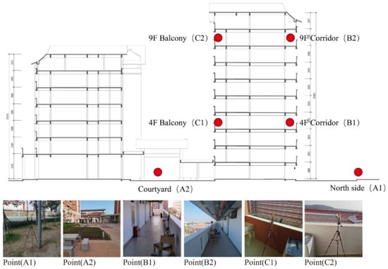 The Kestrel anemometer model NK5500 (Nielsen-Kellerman Company, Minneapolis, MN, United States) was used for the actual measurement of the wind environment. The specific parameters of the instrument are shown in Table 2. The research team conducted the field survey and survey point layout on the morning of the 15th, and began continuously recording 24 h wind environment data with a 2 min data collection interval at 15:30 p.m. on the same day. Based on the survey results, we selected the key areas where respondents reported a poor wind environment and established 6 measuring points, including 2 outdoor measuring points at the roadside grassland on the north side of the teachers’ apartment (A1) and the courtyard center area (A2). There are four indoor measuring locations, including the apartments’ north corridor (B1, B2) and south balcony (C1, C2) on the fourth and ninth floors. The outdoor measuring points are arranged at a height of 1.5 m from the ground. The indoor measuring points are 1 m from walls and other reflective surfaces and 1.5 m from the floor of the building. In order to prevent strong winds from blowing the instruments over during the measurement, all instrument installations were reinforced. According to the users’ living conditions, the sliding door of the south-facing balcony remains open while the north-facing entrance door is closed (Figure 7).