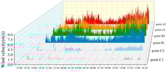 It can be observed that, under the influence of the dominant winter winds in the coastal region, both outdoor test points exhibit the similar trend in wind speed variation: a gradual increase from afternoon to evening, a slow decrease from midnight to early morning, and a significant increase from morning to late afternoon. In the courtyard, strong transient winds exceeding 5 m/s occur frequently in the afternoon and at night, and the maximal wind speed value can reach 8 m/s, which is significantly higher than the comfort evaluation threshold (Figure 8). Comparing the wind speed values at test points A1 and A2, it is noted that the wind speed in the courtyard is slightly lower than that in the green area. The main reason for this is the lack of wind barriers in the grassland area, whereas the teachers’ apartment partially blocks the airflow, reducing the wind speed in the courtyard. However, the effect of wind protection is limited, leading to a severe outdoor wind environment in winter.
