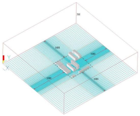 The size of the simulation area directly influences the outcomes of the simulation []. A smaller computational domain can distort the flow field, while a larger computational domain leads to an increased number of grids, resulting in higher computational costs. The computational domain is set to 10H, 10H, and 5H for upstream, downstream, lateral, and height, respectively, based on the experience of previous researchers in setting the computational domain for CFD simulation of residential wind environments [] (Figure 10).
