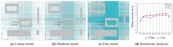 The SPARSOL mesh generation method developed in PHOENICS was used to generate a mesh for the computational domain in such a way that the mesh was dense in areas near the target models and sparse in areas away from the target models. Grid sensitivity analysis was carried out to ensure that the results of the selected grid will not change significantly with finer grid resolution []. The analysis used coarse grid (minimal grid size is 0.2 m, 1.81 million cells in total), middle grid (minimal grid size is 0.05 m, 3.28 million cells in total), and fine grid (minimal grid size is 0.02 m, 5.95 million cells in total). As shown in Figure 11a–c, the difference in size of the three types of grids in the research area must meet the requirement of at least 1.5 times []. The simulated data at the leeward side of apartment (y = 370 m, z =1.5 m) [] of three mesh systems are compared in Figure 11d. The mean deviation between the simulation results by the coarse grid and the medium grid is as large as 24.5%, while the deviation between the medium and fine grids is only 5.2%. Therefore, considering the accuracy and expenditure of computational resources, a medium mesh system was used in this study.