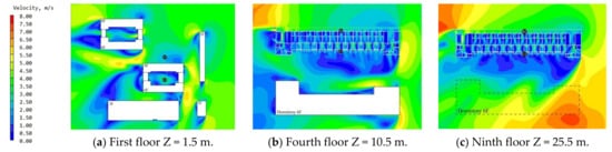 From the H = 1.5 m pedestrian height wind speed contour map (Figure 12a), it can be observed that there are several high wind speed zones around the teacher–student dormitory, which are mainly distributed in the passages and corners between the buildings. Among them, the high wind speed zone between the apartments and the northwestern side of the student dormitories appears to be the most pronounced. Additionally, there is a sharp increase in wind speed in the courtyard, mainly due to the intensified airflow between the apartments and the graduate student dormitories in the narrow courtyard. From the measured points inside the building (Figure 12b,c), it can be observed that under the condition of the entrance door on the north side being open, the strong winter winds penetrate through the building, creating a corridor–living room–bedroom–balcony wind channel. Although the balcony is at the end of the wind channel, it is also affected by the strong winds from the courtyard, as it is situated closer to the outer side of the building.