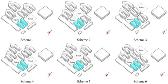 This study is based on the existing college campus, where the layout of the dormitory area is constrained by the road network and the surrounding buildings. The location of the square on the west side of the teacher–student dormitory, serving as a communal area between the canteen and the dormitory area, is not suitable for relocation. On the other hand, the relative positions of the basketball court and undergraduate dormitory located in the upwind direction of the teacher–student dormitory have a more significant impact on the wind environment. In terms of the dormitory grouping approach, both determinant type and enclosure type are common forms in the construction of the dormitory area in Chinese universities. Therefore, based on the original layout framework, this study investigates the relative positions of the basketball court and the student dormitory as well as the different enclosure methods of dormitory groups. From these two dimensions, we propose six programs, categorized into two types, of which Programs 1~3 represent an enclosing layout, and Programs 4~6 adopt a row-type layout (Figure 13).