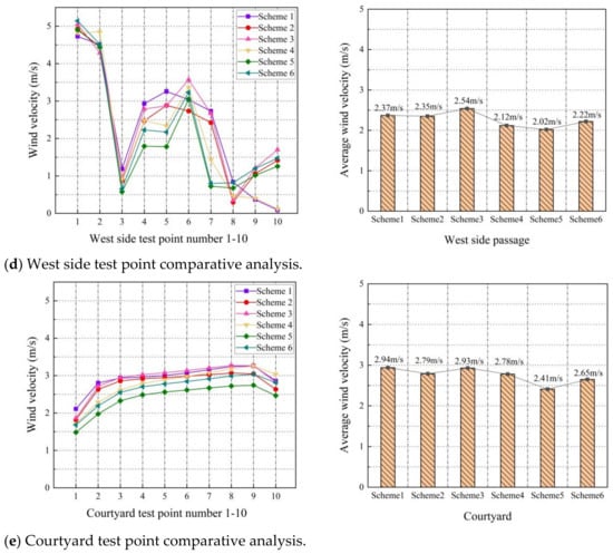 Comparing the wind speed change graphs of each test point in the south side passage (Figure 15c), it can be observed that the trends of all schemes are the same. The wind speeds decrease abruptly from test point 1 to 3, while the fluctuation from test point 3 to 10 is smoother, showing an overall decrease from the east side to the west side. The average wind velocity comparison is as follows: scheme 5 (2.44 m/s) > scheme 6 (2.38 m/s) > scheme 2 (2.16 m/s) > scheme 3 (1.92 m/s) > scheme 4 (1.17 m/s) > scheme 1 (1.10 m/s). The wind speed of scheme 1 and 4 is significantly lower compared to the other schemes which is due to the strong canyon wind effect formed in the south passage by the aligned layout along with the building barrier on the north side of the teacher–student dormitory. The high-speed airflow in scheme 1 and 4 is concentrated in the passage of the north side of the open space and the west side of the square, while the wind speed in the south passage is lower.