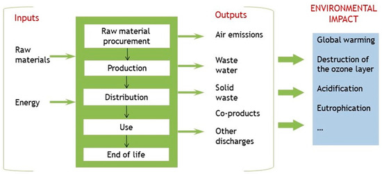 The life cycle assessment (LCA) methodology is a tool for quantifying the environmental impacts of a material, product, or process and, therefore, its sustainability. The standard EN ISO 14040:2006/A1 “Environmental management. Life cycle assessment. Principles and framework” [2] defines LCA as “the collection and evaluation of inputs, outputs and potential environmental impacts of a product system throughout its life cycle”, as shown in Figure 1. LCA calculation is a complex task that requires technical knowledge and experience in both the application of its methodology and the interpretation of data and results. It can be applied to the environmental assessment of building materials and products, as well as to the constructed building, although it is seldom used to optimize the design or help to make decisions in the early stages of the project. Its use has the potential to improve environmental, social, and economic sustainability [3].