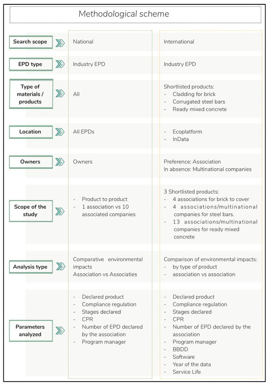 The aim of this study is to carry out a detailed analysis of the EPDs available for use as input data for the calculation of building LCAs. In the hierarchy established in the standard [8], it is the input data that is of the highest quality for calculating the LCA of buildings. The data are established within a program manager that manages and generates a compliance framework. Accordingly, they are checked by established third parties according to the current regulations and declared by the manufacturers or their associations who contribute their own data. Sectoral EPDs are chosen from among the different kinds of EPD. These are produced by several manufacturers or manufacturer associations and contain a consensus of the members. These associates often represent a large share of the market production, making the data they provide wide-ranging. In turn, the heterogeneous data from a range of sources make them perfect for analysis and verification.