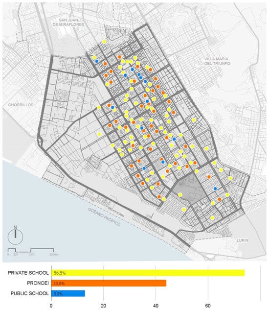 In the district of Villa El Salvador, three types of early education centers have been identified, of which 56.5% are private schools, 33.6% are PRONOEIs, and 9.9% are public schools (Figure 4). Of these educational centers in the district, 50% have infrastructure that is in a state of abandonment and qualitative deficit, requiring partial or total replacement in some cases [17]. These data are concerning because safe and suitable facilities for activities at this early age would not be provided.
