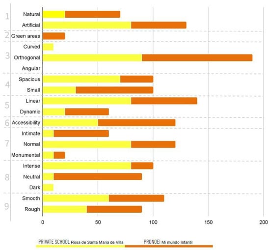 The evaluation conducted at the two selected educational centers, Rosa de Santa Maria de Villa private school and PRONOEI Mi Mundo Infantil, provides us with information about the state and application of neurostimulating architecture in the facilities such as classrooms, playgrounds, and gardens. These indicators are not consciously applied based on established parameters; in most cases, the indicators are insufficient/medium (Figure 8) (Table 7 and Table 8).