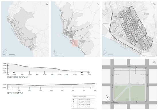 (a) Map of Parú. (b) Map of Metropolitan Lima. (c) Map of the district of Villa El Salvador. (d) Intervention area.