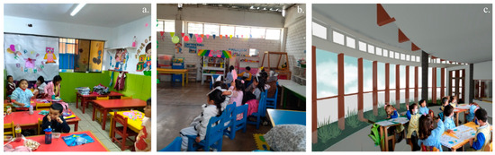(a) Current classroom inside Rosa de Santa Maria de Villa private school. (b) Current classroom inside PRONOEI Mi Mundo Infantil. (c) Classroom for the architectural proposal.