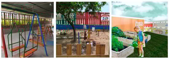 (a) Current playground of the PRONOEI Mi Mundo Infantil. (b) Current school garden of the PRONOEI Mi Mundo Infantil. (c) Proposal for school garden.