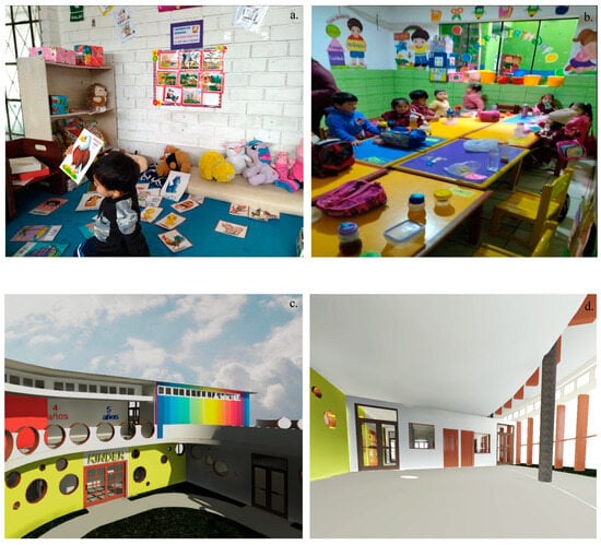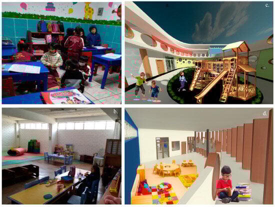 (a) Reading area of the PRONOEI Mi Mundo Infantil. (b) Dining area of Rosa de Santa Maria de Villa private school. (c) Proposal for the use of intense colors in the playground. (d) Proposal for the use of neutral and basic colors in the classrooms.