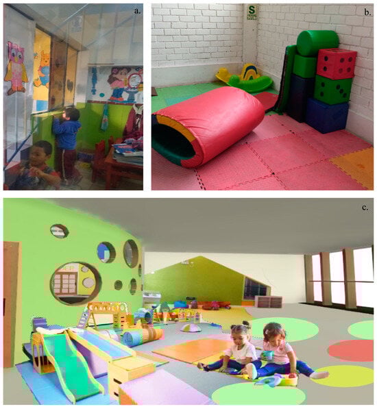 (a) Current classroom of Rosa de Santa Maria de Villa private school. (b) Game area of the PRONOEI Mi Mundo Infantil. (c) Proposed materiality for a playground.