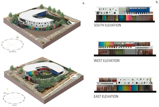 The proposal incorporates strategies that would allow for cross-ventilation and natural daylight throughout the day (Figure 19a,b). This is due to the strategic orientation to the southeast and northwest, which would enable the entry of indirect light. Additionally, the creation of an acoustic buffer via the implementation of vegetation in the southeast of the site has been proposed, as well as a school garden to take advantage of the orientation, facilitate waterproofing, and provide thermal insulation.