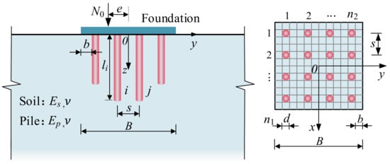 The typical PRF with rectangular rafts and n (n = n1 × n2) dissimilar circular piles in homogeneous elastic medium is illustrated in Figure 1, and the coordinate system is also chosen, as Figure 1 indicates. n1 and n2 are the numbers of rows and columns for the pile configuration, respectively, d and s are the pile diameter and center-to-center distance of neighboring piles, li denotes the length of pile i, b indicates the clear overhang width of the cap as extended from the outer piles, and Es and Ep are the Young’s moduli of the soil and piles, respectively. Poisson’s ratio for the soil and piles are assumed to be the same and equal to ν to simplify the analysis. The applied eccentric vertical load is set to N0. The eccentricity e is the distance from the load point to the raft foundation center, and no tension stress zone between the raft and soil is allowed in regular PRF design; therefore, the range of e/B is considered from 0 to 1/6.