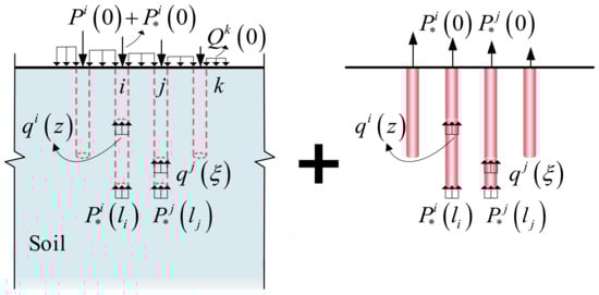 Following the method proposed by Muki and Sternberg [], the pile–soil system is decomposed into the extended soil and fictitious piles (Figure 2). And then, force analysis is performed considering the two systems separately. For the discretized m square sub-elements, the vertical load acting at the i-th pile head and k-th soil unit head are expressed as Pi(0) and Qk(0) (i = 1, 2, …, n, k = n + 1, n + 2, …, m), respectively. and qi(z) are the axial force and shaft resistance of the i-th fictitious pile at a depth z. Then, the load acting at the extended soil is obtained by considering the interaction force between two decomposed systems. For instance, and are the axial force of the i-th fictitious pile head and bottom, and and Qk(0) are the axial forces of the i-th and k-th extended soil unit head.