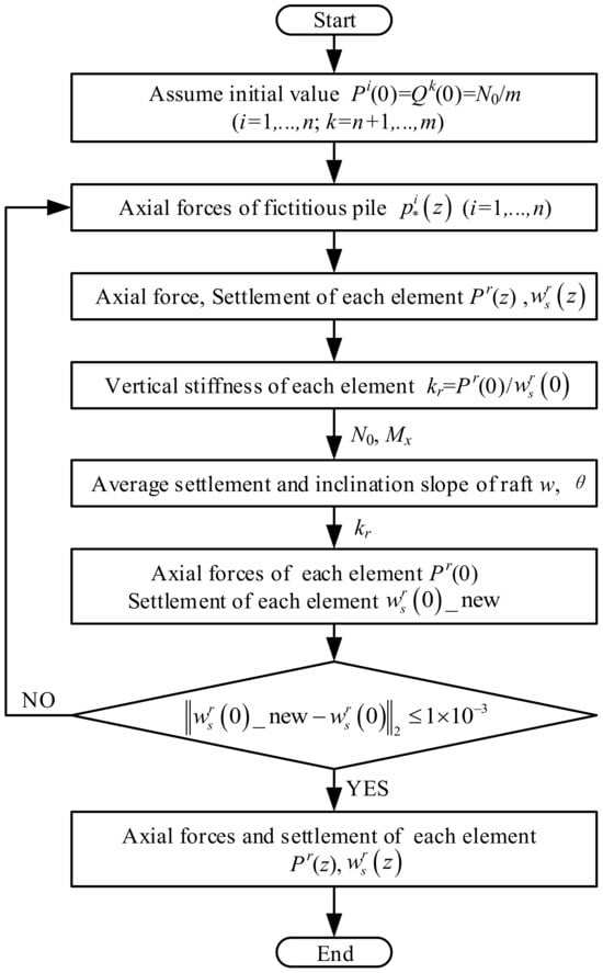 An iterative procedure is proposed to solve this definite problem as the initial values of Pi(0) and Qk(0) (i = 1, 2, …, n, k = n + 1, n + 2, …, m) cannot be known; the basic processes are given in Figure 3 and briefly introduced as follows. The first step is to assume the initial load values of each element Pi(0)= Qk(0) = N0/m at z = 0; the assumption can satisfy the vertical load equilibrium condition. Then, the axial forces of each fictitious pile can be determined by Equation (11). The real axial force and settlement of each element Pr(z) and can be obtained from Equations (9) and (12). Therefore, the vertical stiffness of the top of each element can be achieved easily. The average settlement and inclination slope of the raft w and θ can be calculated by establishing the vertical equilibrium and moment equilibrium equations of the raft by the given load condition N0 and Mx. Furthermore, the settlement of each element can be obtained again from Equation (15) and denoted by ; the real axial force of each element Pr(0) can be recalculated by Equation (14). If the cumulative difference between and cannot be ignored, for instance, , recalculation back to the first step is necessary by renewing the initial load values of each element Pr(0), until . Finally, we can obtain the axial forces and settlement along the depth of each element Pr(z) and .