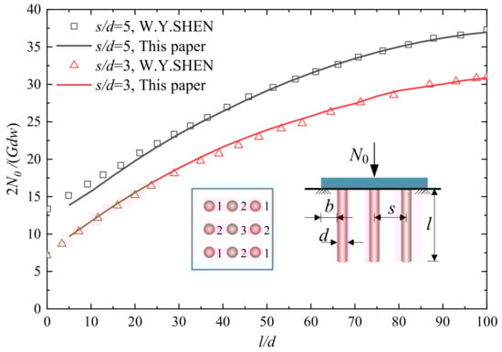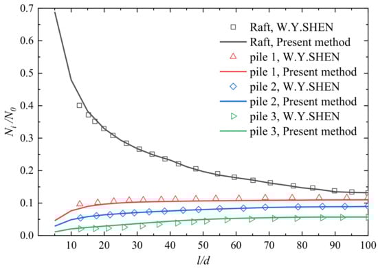 In order to verify the accuracy of the present method, comparison with reported cases is needed. W.Y. Shen [] reported the solutions for a 3 × 3 PRF under vertical load in homogeneous soil based on a variational method. Those solutions are obtained by the present method and compared, as shown in Figure 4 and Figure 5. Figure 4 also illustrates the PRF configurations and load condition. Good agreement in the non-dimensional vertical stiffness 2N0/Gdw and the load sharing ratio of the raft and piles Ni/N0 with different l/d can be observed between the two different methods, where N0 and w are the vertical load and raft settlement, respectively, G is the soil shear modulus, Ep/G = 3000, v is taken to be 0.499, and the raft overhang b = d.