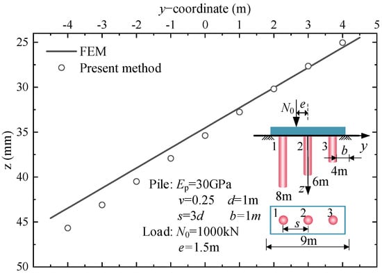 Pile raft foundation (PRF) is one of the most common foundations for buildings and bridge piers [], particularly for the weaker soil conditions, which has been frequently subjected to eccentric vertical load due to its irregular shape or moment loads from superstructures []. Therefore, PRF with dissimilar pile lengths has received considerable attention with the aim of reducing the excessive settlement and differential settlement of superstructures at a lower cost. The settlement characteristics of dissimilar PRF under eccentric vertical load are not well understood due to the complex interactions among the piles–soil–raft []. With the PRF designs that have been transformed from capacity-based criterion to serviceability-based criterion gradually, the threshold values of average and differential settlement are frequently induced to define the serviceability limit states. For instance, the displacement corresponding to 2%d for the master node is set to the serviceability state []. Therefore, it is imperative to accurately achieve the behavior of dissimilar PRF under eccentric vertical load within elastic theory.