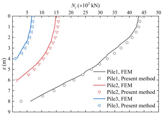 A FEM validation study based Plaxis 3D is also performed to ensure that the present method produces reliable and accurate results. The length, width and height of the model are 40 times the raft width, respectively. The bottom of the model is fixed in both horizontal and vertical directions. The four side boundaries are fixed only in the horizontal direction and free in the vertical direction. The elastic constitutive model is considered for soil elements, which is consistent with the theoretical model. The 3 × 1 PRF with dissimilar pile length rested on homogeneous soil with Es = 30 MPa and v = 0.25; the pile parameters and load condition are detailed in Figure 6. Figure 6 also shows a comparison of the raft settlement response obtained from the present method with the FEM. The axial force distribution along the depth of piles obtained from the present method and the FEM are plotted in Figure 7. The raft and piles responses from both two methods are quite close to each other.