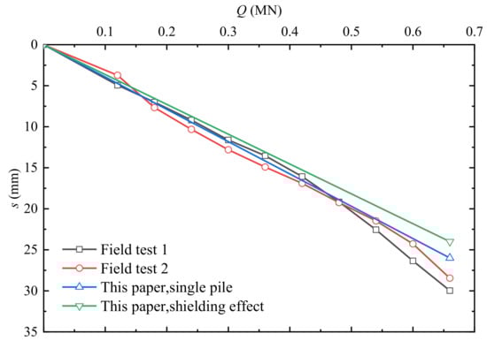 The Q-s curves of the two load tests and theoretical solutions are presented in Figure 10 and are similar at the initial stage. With the loading increases, a difference in the Q-s curves between the two methods can be observed as the plastic settlement emerges. Comparing the theoretical solutions indicates that the enforcement and shielding effect of neighborhood piles can have limited improvements in the pile stiffness due to the large pile spacing.