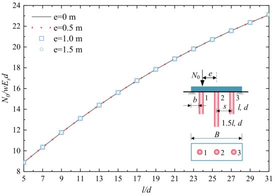 A 3 × 1 PRF with dissimilar pile length under eccentric load is first proposed, as shown in Figure 11. The Es and v of soil are taken to be 30 MPa and 0.25, respectively, and Ep = 30 GPa, d = b = 1 m, v = 0.25 and s = 3 d for the pile parameters. The results are presented for the non-eccentric load (e = 0 m) and compared to the eccentric load with different eccentricity e (e = 0.5 m, 1.0 m, 1.5 m). The length to diameter ratio of the side piles (pile 1 and pile 3) is set as l/d, and keeping the pile length ratio between the middle pile (pile 2) and side pile is 1.5.