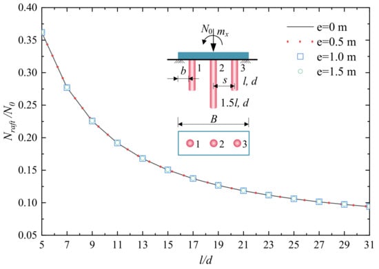 Figure 11 and Figure 12 display the effects of l/d on the non-dimensional vertical stiffness N0/wEsd and load sharing ratios of the raft Nraft/N0 for different eccentricity e. The results show that the N0/wEsd increased with l/d and the Nraft/N0 decreased with l/d, and furthermore, the different eccentricity e ranging from 0 m to 1.5 m, as is the case in the present analysis, has a small influence on the parameters N0/waEsd and Nraft/N0. A smaller increase in Nraft/N0 is to be expected due to the larger vertical stiffness of the piles with the l/d increase.