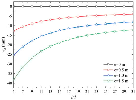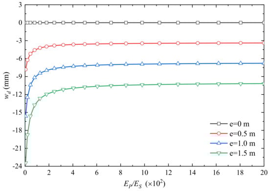 Figure 24 shows that the increase in Ep/Es causes a significant reduction in wd regardless of the eccentricity e, and less pronounced variation for wd is observed when Ep/Es larger than 200. Furthermore, the greater the eccentricity e, the larger the wd is performed due to the greater interaction among the pile–soil–raft.