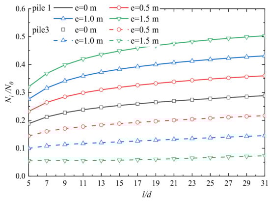 The wd and the Ni/N (i = 1, 3), as expected, are significantly affected by the eccentricity e, as shown in Figure 13 and Figure 14. For the differential settlement wd, the increase in eccentricity e causes a significant increase in wd, regardless of l/d, and the influence degree of eccentricity e is more significant for shorter piles, becoming less significant for longer piles for all of the conditions. Relative to the eccentricity e = 0.5 m condition, the increase in the differential settlement wd is about 100% and 200% for e = 1.0 m and 1.5 m, respectively, for the range of l/d. The predicted e-wd response trend using the proposed method compares well with [].
