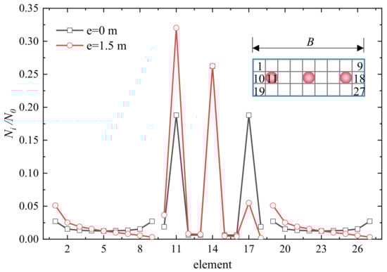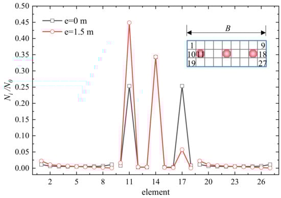 Figure 15 and Figure 16 provide insights into the load sharing ratio of each element for l/d = 5 and 15. It is noted that the load sharing ratio of the corner elements is greater than the side elements, and the side elements are larger than the center elements due to the pile–soil–cap interactions under the center load (e = 0 m), which agrees well with the published results from Liang and Song [] and Randolph and Wroth []. For the PRF under eccentrical load, the load sharing ratio changes with eccentricity e obviously, and the load sharing ratios for elements 9, 18 and 27 are about 0 as the eccentricity e = 1.5 m = B/6. For l/d = 5, the load sharing ratio of pile 1 (element 11) is about 0.19 for the center load and increases to 0.37 for eccentricity e = 1.5 m. For l/d = 15, the load sharing ratio of pile 1 is 0.25 and 0.49, respectively.