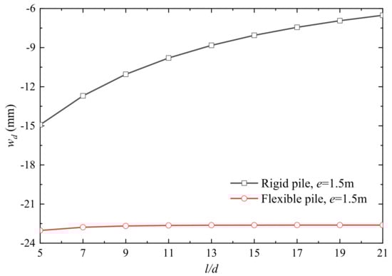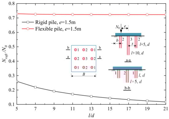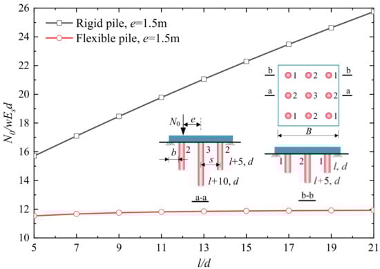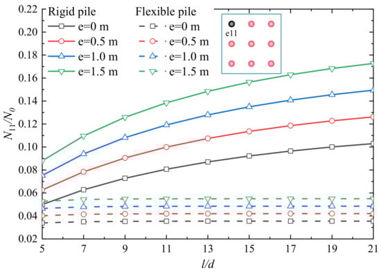 The variation of the differential settlement wd for a PRF with different l/d and pile rigidity is similar with non-dimensional vertical stiffness N0/wEsd, as shown in Figure 19. The load sharing ratio of element 11 N11/N0 in the 3 × 3 PRF with different pile rigidity and eccentricity e are shown in Figure 20. The load sharing ratio of the flexible pile condition are correspondingly smaller than the rigid pile condition.