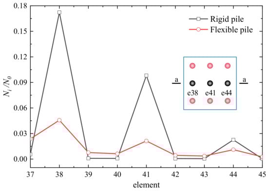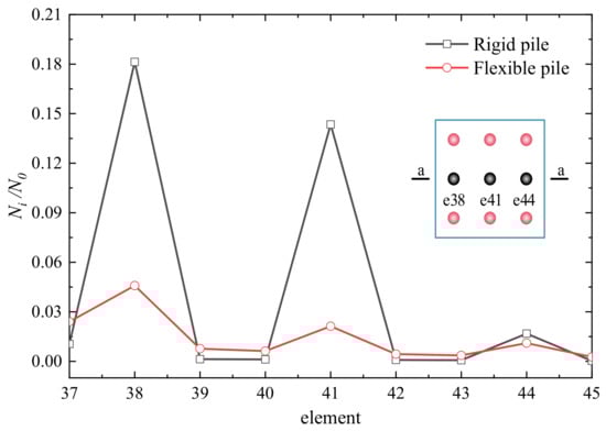 To provide insights into the load sharing ratios of typical elements under eccentric vertical load, the load sharing ratios of element 37 to element 45 for different pile rigidity are compared in Figure 21 and Figure 22. The pile rigidity has a significant influence on the load sharing ratio for all l/d. The load sharing ratio of the edge pile (element 38), center pile (element 41) and edge pile (element 44) with l/d = 5 is 0.181, 0.143 and 0.017 for the rigid pile, and 0.046, 0.02 and 0.01 for the flexible pile. The corresponding ratios for l/d = 15 are 0.172, 0.10 and 0.02, and 0.05, 0.02 and 0.01.